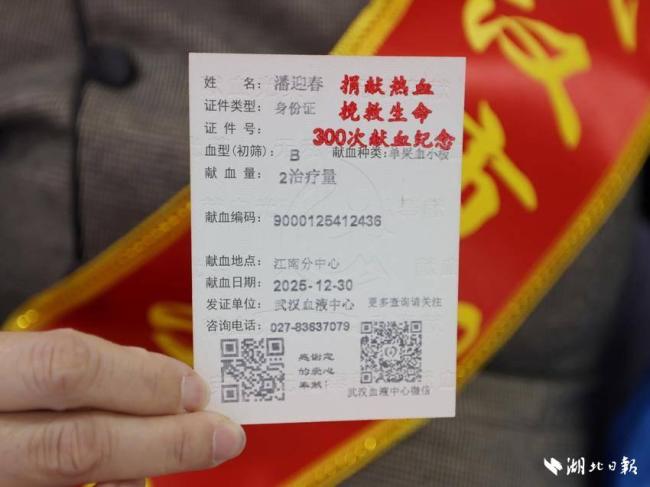 武汉大学教授21年无偿献血300次 爱心接力不停歇。12月30日上午,在武汉血液中心江南分中心申搏官网,武汉大学历史学院教授、博士生导师潘迎春静静地躺在献血椅上,神情舒展,面带微笑。鲜红的血液从她的左臂缓缓流出——这是她21年来的第300次无偿献血。 今年57岁的潘迎春自2004年首次献血至今,累计捐献全血及成分血达300次,总献血量约130400毫升,据估算帮助至少